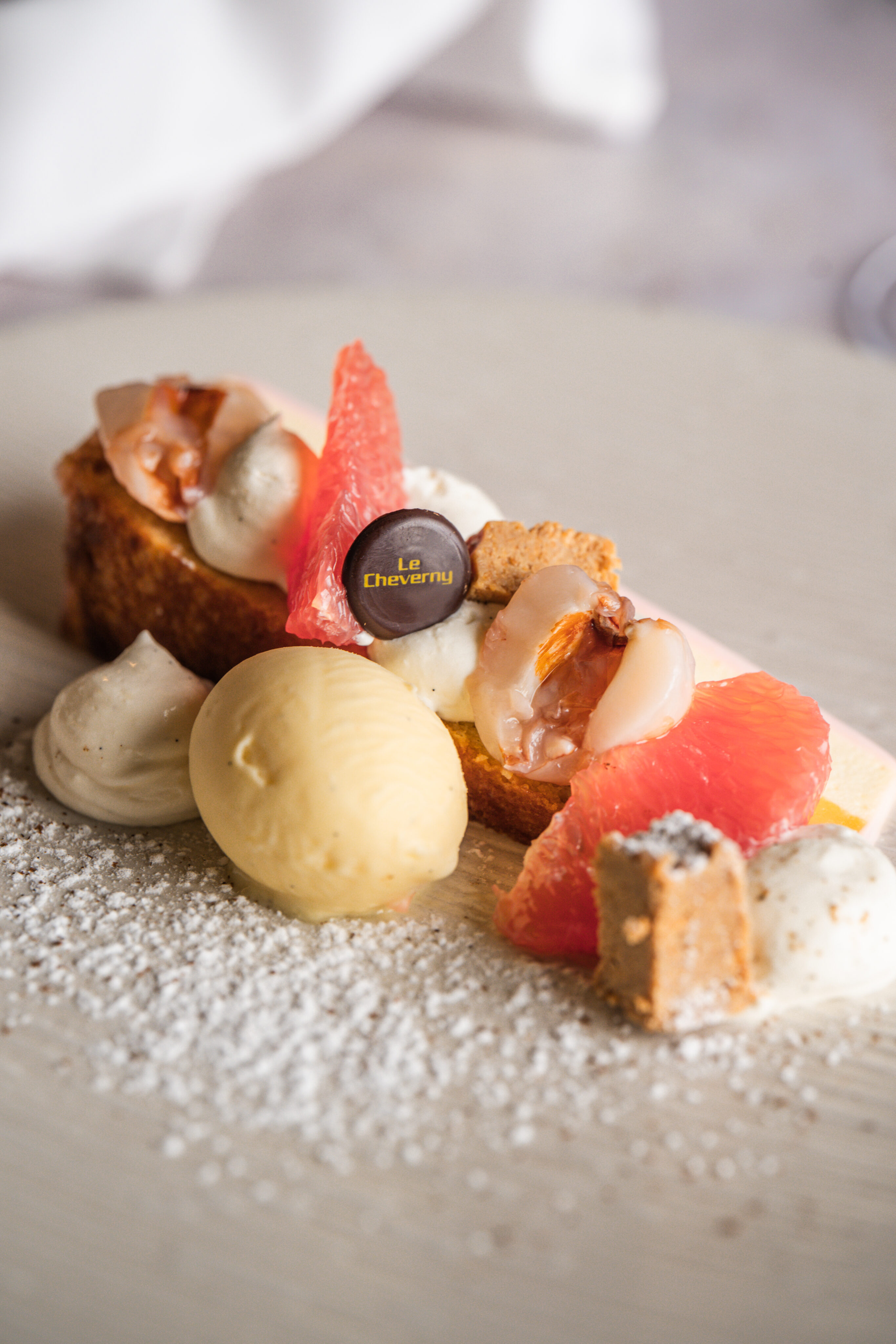 Entremets jasmin, litchi et pamplemousse, croquant praliné.