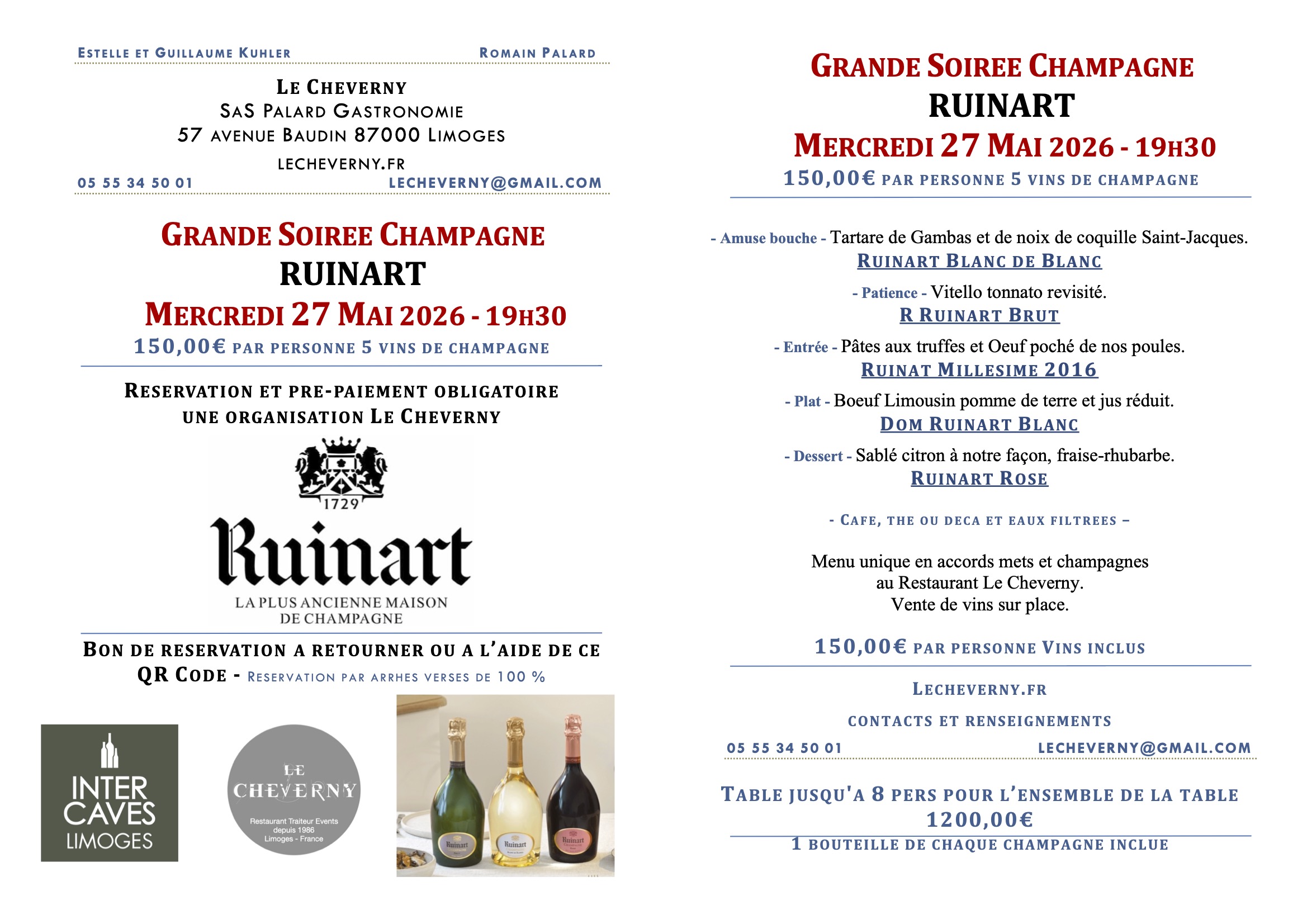 Pré Paiement complet Menu unique avec accord mets et champagne de la maison Ruinart. – Le Cheverny
